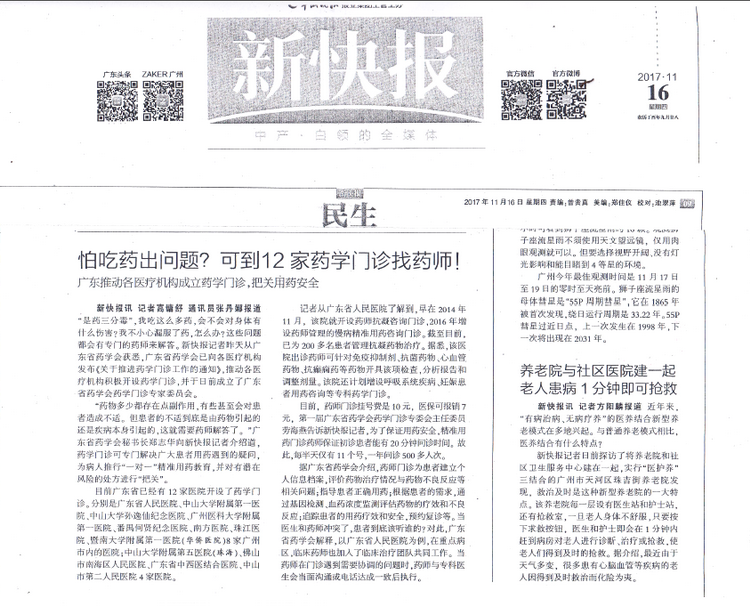 2017年11月16日,《新快報》以“怕吃藥出問題?可到12家藥學門診找藥師”為題,詳細報道了廣東省藥學會推動各級醫(yī)療機構(gòu)成立藥學門診系列工作。