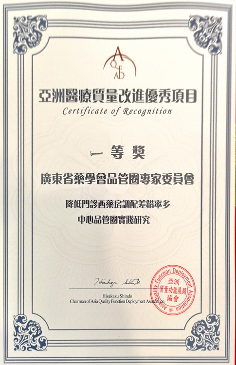 “廣州醫(yī)院藥學(xué)多中心圈”榮獲第三屆亞洲質(zhì)量功能展開和創(chuàng)新研討會(huì)亞洲醫(yī)療質(zhì)量改進(jìn)優(yōu)秀項(xiàng)目一等獎(jiǎng)