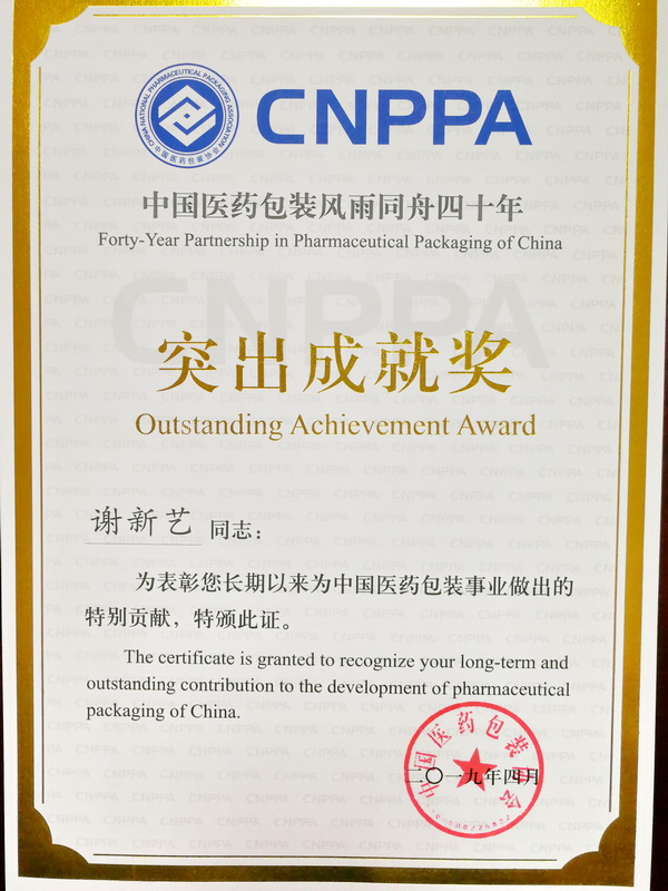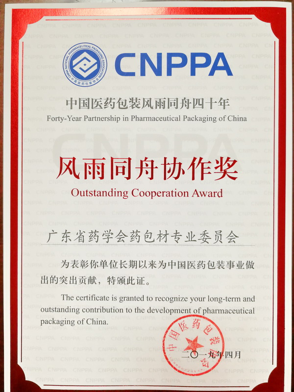 4月26日,在??谡匍_的中國醫(yī)藥包裝協(xié)會第十次會員大會上,廣東省藥學(xué)會藥用包裝材料專業(yè)委員會獲得“風(fēng)雨同舟協(xié)助獎(jiǎng)”,專委會主任委員謝新藝同志獲得“突出成就獎(jiǎng)”,表彰和鼓勵(lì)廣東同行為中國醫(yī)藥包裝事業(yè)發(fā)展作出的貢獻(xiàn)。