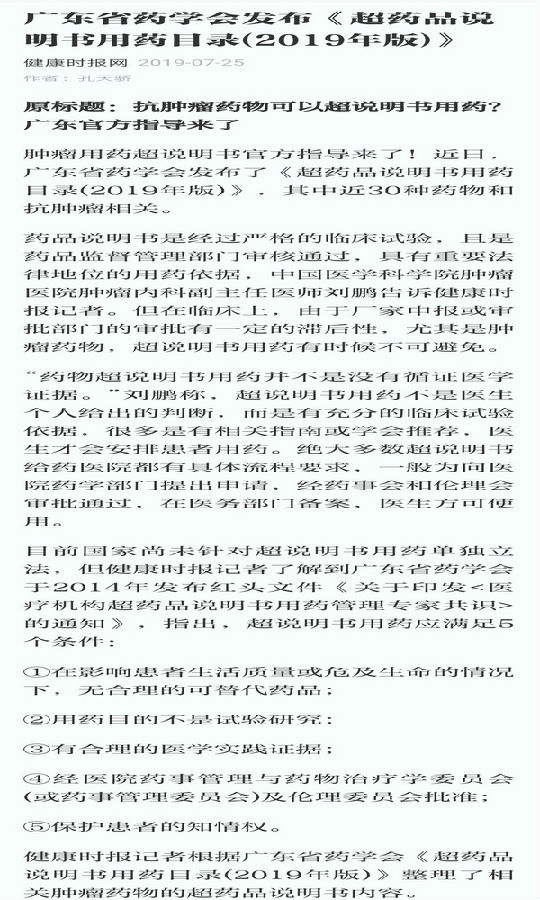 2019年7月25日,《健康時報》記者孔天驕根據(jù)廣東省藥學會《超藥品說明書用藥目錄(2019年版)》(粵藥會〔2019〕75號、本會6月17日官網(wǎng)發(fā)布),整理了相關腫瘤藥物的超藥品說明書內(nèi)容一文。