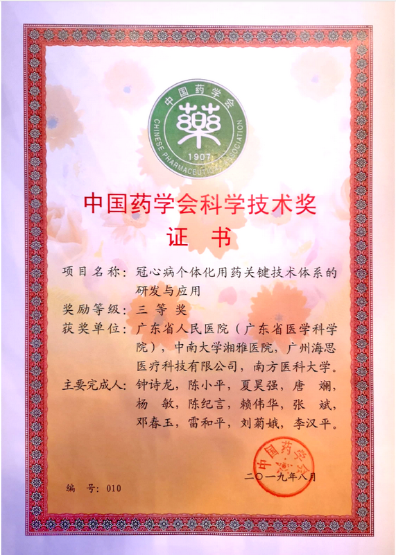 一、廣東省人民醫(yī)院藥學(xué)部鐘詩龍等的《冠心病個(gè)體化用藥關(guān)鍵技術(shù)體系的研發(fā)與應(yīng)用》,榮獲2019年中國藥學(xué)會(huì)科學(xué)技術(shù)獎(jiǎng)三等獎(jiǎng)。