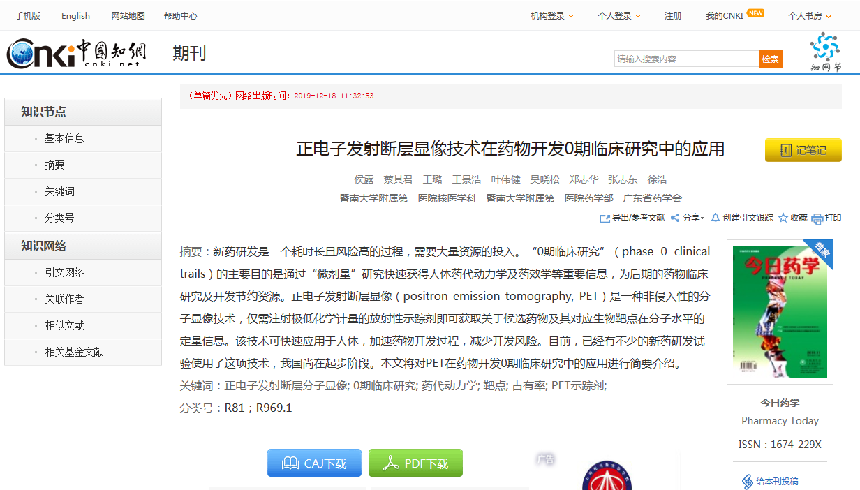 本文已在中國知網(wǎng)優(yōu)先發(fā)表,引用格式為:[1]侯露,蔡其君,王璐,王景浩,葉偉健,吳曉松,鄭志華,張志東,徐浩.正電子發(fā)射斷層顯像技術(shù)在藥物開發(fā)0期臨床研究中的應(yīng)用[J/OL].今日藥學(xué):1-18[2019-12-18].http://kns.cnki.net/kcms/detail/44.1650.R.20191218.1132.002.html.