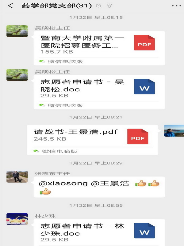 1月21日,吳曉松主任帶領(lǐng)張志東、王景浩、林少珠、吳玲、李康憲、黎少鵬等7位具有豐富經(jīng)驗的藥師,率先向院里提交了“請戰(zhàn)書”,志愿加入防治新型冠狀病毒工作團(tuán)隊,為抗擊疫情,作出自已的貢獻(xiàn)。