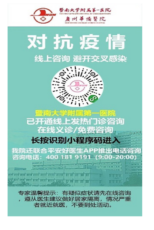2、暨南大學(xué)附屬第一醫(yī)院(廣東省藥學(xué)會(huì)藥物治療學(xué)專業(yè)委員會(huì)副主任委員單位):長(zhǎng)按識(shí)別小程序碼進(jìn)入-進(jìn)入網(wǎng)上咨詢界面-點(diǎn)擊“新型冠狀病毒疫情”-在出診列表中選擇藥師、咨詢用藥相關(guān)問題。