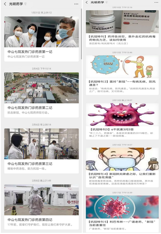 為指導臨床新冠肺炎的合理用藥,藥學部迅速組織臨床藥學團隊通過查閱指南、文獻和藥品說明書等,于1月27日發(fā)布了《洛匹那韋利托那韋(克力芝)臨床應(yīng)用指引》、《α-干擾素臨床應(yīng)用指引》。同時,針對網(wǎng)上藥師門診所收集到的民眾疑惑與需求,藥學部于2月10日起在《光明藥學》公眾號上推出了“抗冠特刊”系列科普文章,連續(xù)發(fā)布包括克力芝、防風通圣、α-干擾素、連花清瘟、利巴韋林等共5篇有關(guān)藥品使用科普文章。此外,臨床藥學團隊還參與了由中山大學腫瘤醫(yī)院牽頭的抗病毒藥物臨床應(yīng)用指引的撰寫工作。