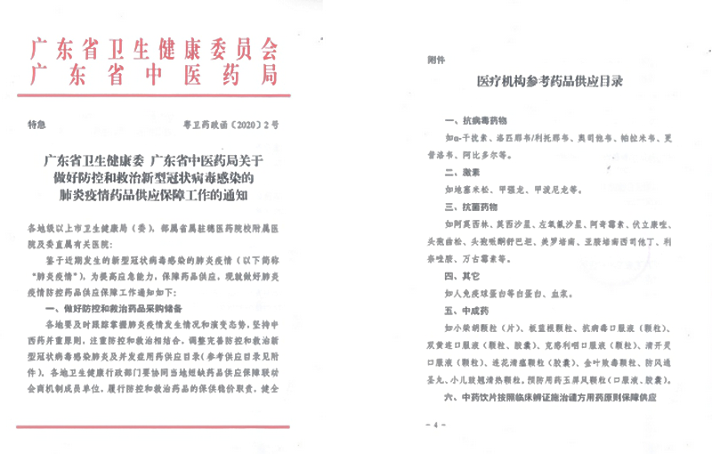 2020年1月21日,廣東省衛(wèi)健委委托陳吉生主任、吳紅衛(wèi)主任起草針對(duì)新型冠狀病毒感染肺炎有關(guān)“落實(shí)用藥相關(guān)制度”的建議和“醫(yī)療機(jī)構(gòu)防控和救治藥品供應(yīng)目錄”;1月23日廣東省衛(wèi)生健康委及廣東省中醫(yī)藥局下發(fā)《關(guān)于做好防控和救治新型冠狀病毒感染的肺炎疫情藥品供應(yīng)保障工作的通知》(粵衛(wèi)藥政函[2020]2號(hào)),文件中采用了陳主任關(guān)于用藥相關(guān)制度的建議及救治藥品供應(yīng)目錄。