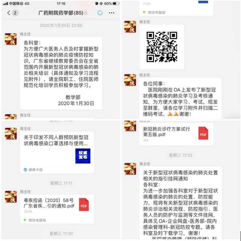 陳吉生主任時(shí)刻根據(jù)國家、省委、院黨委各項(xiàng)決策部署,組織全科室人員學(xué)習(xí)新型冠狀病毒肺炎防控相關(guān)培訓(xùn)。利用微信群組織科室全體人員學(xué)習(xí)《新型冠狀病毒肺炎相關(guān)培訓(xùn)》、《新型冠狀病毒感染的肺炎醫(yī)務(wù)人員防控》、《新型冠狀病毒感染的肺炎口罩使用指引》及各版本《新型冠狀病毒感染的肺炎診療方案(試行)》等,并進(jìn)行相關(guān)考核。