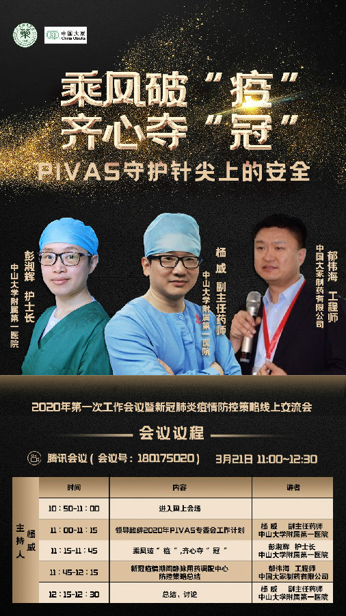 根據(jù)疫區(qū)醫(yī)院的感控經(jīng)驗及PIVAS設(shè)計建設(shè)的特點,為分析PIVAS各區(qū)域受疫情感控的存在風(fēng)險,交流在“新冠”疫情期間,PIVAS日常工作中的感控措施,提高省內(nèi)PIVAS感控管理水平,防止院內(nèi)交叉污染,保證靜脈用藥和工作人員安全,廣東省藥學(xué)會靜脈用藥調(diào)配專家委員會(以下簡稱靜配專委會)于2020年3月21日舉辦了一場線上交流會,探討PIVAS的質(zhì)量安全與感控管理。