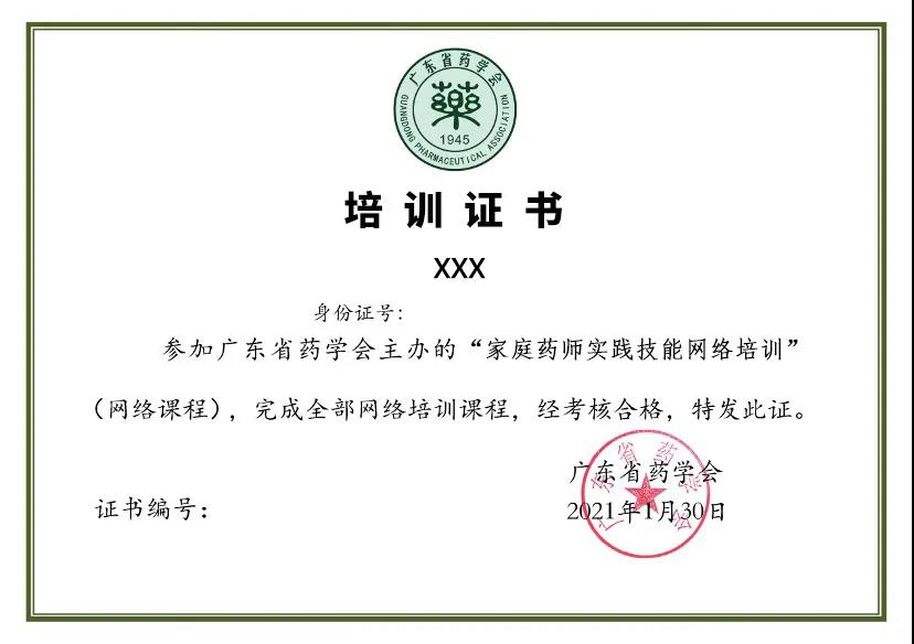 通過培訓(xùn)考核您將獲得廣東省藥學(xué)會頒發(fā)的培訓(xùn)證書(電子證書,電子證書以實物為準(zhǔn))。
