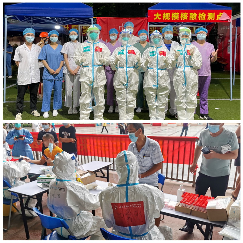 核酸采樣必須在通風(fēng)透氣的地方,加之近期廣州天氣多變,酷暑、暴雨、密不透風(fēng)的防護(hù)服,給工作人員無(wú)端增添了難以想象的困難。一輪工作下來(lái)時(shí),身上的衣服都被汗水濕透;但經(jīng)過(guò)短暫的修整后,面對(duì)現(xiàn)場(chǎng)等待核酸檢測(cè)的群眾,二話不說(shuō)還要繼續(xù)投入工作。一個(gè)小時(shí)、兩個(gè)小時(shí)······幾個(gè)小時(shí),大家都堅(jiān)守崗位,規(guī)范各項(xiàng)操作。每天結(jié)束工作后往往已是深夜,但大家拖著疲憊的身軀互道辛苦后,仍積極報(bào)名參加第二天的核酸采樣工作,其中有幾位藥師先后共參與過(guò)5次,令人感動(dòng)。