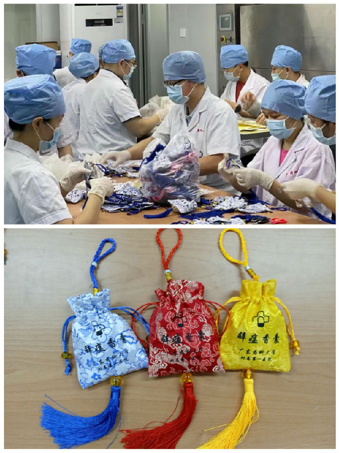 除了核酸采樣工作,藥學(xué)部黨支部利用中醫(yī)在防控瘟疫方面的優(yōu)勢(shì)和藥學(xué)人員豐富的中藥學(xué)知識(shí)、經(jīng)驗(yàn),于5月29日組織15名黨員、藥師利用周末時(shí)間緊急制作抗疫香囊。在時(shí)間緊、任務(wù)重、沒(méi)有機(jī)械化生產(chǎn)設(shè)備的條件下,藥學(xué)部支部書(shū)記陳永合理分配任務(wù),保證了各項(xiàng)工作有序進(jìn)行,在最短時(shí)間內(nèi)制作完成了500多個(gè)香囊并送至前線需要的人員手中,從另一方面支援抗疫戰(zhàn)場(chǎng)。