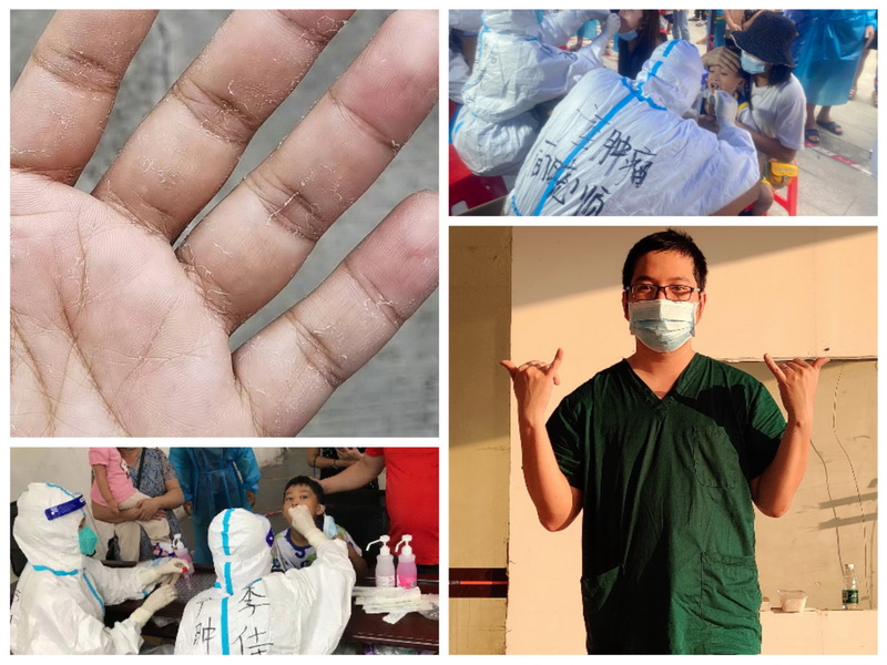 6月的廣州酷暑難耐,在核酸采集現(xiàn)場,面對排著長龍的群眾,簡主任半開玩笑地說:“楊家村真是人丁興旺啊”,一邊說,一邊緊張工作著。藥師們?yōu)榱思涌觳蓸铀俣?,一直不停歇地工作,有的甚至連續(xù)采樣7小時、直到接班同事上崗才脫下防護(hù)服喝第一口水。雖然汗水濕透了衣服,手掌蛻了一層皮,但依然洋溢著勝利的喜悅,分明是在說:與病毒賽跑,我們提前完成了任務(wù)!