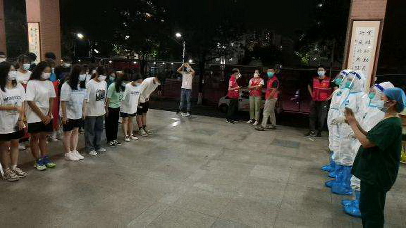 6月5日傍晚,白云區(qū)嘉禾街道緊急求援:市交職學(xué)校4000多師生需要緊急支援。剛剛脫下防護(hù)服還沒來得及喘口氣的鄧?yán)ニ帋熀推渌?位醫(yī)務(wù)人員,用最快的速度收集好檢測物品,前往該校支援核酸檢測。這已經(jīng)是他們當(dāng)天的第二場核酸采樣工作,對精力、體力和意志力都是很大考驗(yàn)。經(jīng)過4個小時的戰(zhàn)斗,他們順利完成任務(wù),就在收拾行裝準(zhǔn)備離開的時候,最后檢測完的同學(xué)們列隊(duì)向他們深深鞠躬致謝,該校負(fù)責(zé)組織的老師動情地說:“感恩您們醫(yī)務(wù)人員的守護(hù),您們敬業(yè)的精神是我們學(xué)習(xí)的榜樣!”鄧?yán)ニ帋熁貞浾f:“當(dāng)時感動又驚喜,一切汗水和勞累都是值得的?!?/span>