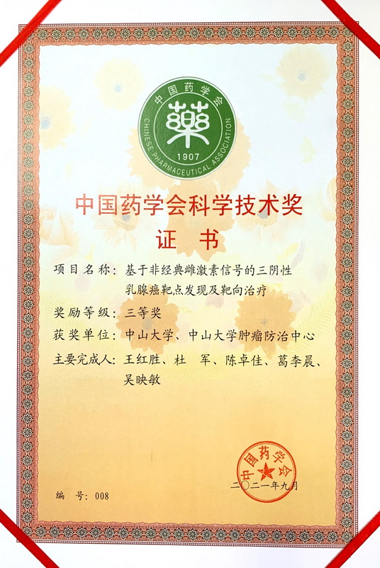一、第十六屆中國藥學(xué)會科學(xué)技術(shù)獎:由廣東省藥學(xué)會推薦、中山大學(xué)藥學(xué)院王紅勝以第一完成人申報(bào)的科技成果“基于非經(jīng)典雌激素信號的三陰性乳腺癌靶點(diǎn)發(fā)現(xiàn)及靶向治療”獲得三等獎,主要完成人--王紅勝、杜軍、陳卓佳、葛李晨、吳映敏,主要完成單位為:中山大學(xué)、中山大學(xué)腫瘤防治中心。