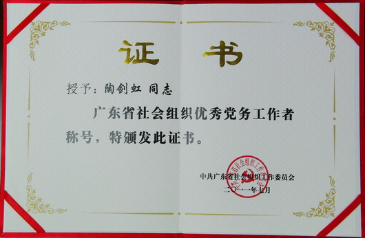 2011年7月18日下午,在中共廣東省社會組織工作委員會召開的表彰大會上,廣東省藥學(xué)會黨支部被授予“廣東省社會組織先進黨組織”光榮稱號,學(xué)會秘書長、黨支部書記陶劍虹被評為“廣東省社會組織優(yōu)秀黨務(wù)工作者”。