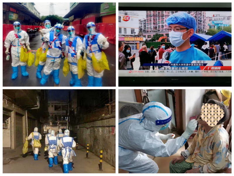 二、勇往直前,敢于擔(dān)當(dāng)。按照上級(jí)統(tǒng)一部署,藥學(xué)部先后派出譚婧、謝燦坤、王明歡、許江濤、朱國威等10多名藥師參加突擊隊(duì)進(jìn)駐海珠、白云、荔灣高風(fēng)險(xiǎn)封控區(qū)域援助抗疫。疫情初發(fā)時(shí)病源主要集中在海珠區(qū)和白云區(qū)的城中村,人口密度高、環(huán)境復(fù)雜,村里大多數(shù)是“握手樓”,巷子窄,光線暗,他們的任務(wù)是上門挨家挨戶做抗原檢測、核酸檢測,進(jìn)行疫情排查,但是一開始時(shí)對(duì)上門采樣地理位置不熟悉,尋覓位置相對(duì)比較困難,需要一戶戶進(jìn)行電話咨詢。每天掃樓任務(wù)非常艱巨,身上還掛滿酒精、拭子、試管負(fù)重爬樓,有時(shí)候甚至要工作到半夜,打著手電在夜色深巷中行進(jìn),仿佛一只只孤單的螢火蟲在黑暗穿梭,與病毒作堅(jiān)強(qiáng)的斗爭。汗水濕透的衣服、霧氣蒸騰的面屏、勒出皺褶的臉龐和雙手,換回了“滿載而歸”的采樣標(biāo)本。即使環(huán)境如此惡劣,工作強(qiáng)度如此高,我們的藥師們始終保持樂觀的心態(tài),不畏艱苦,迎難而上!