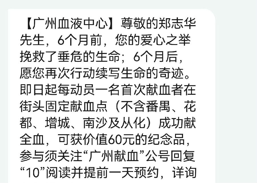 其實,不用廣州血液中心的短信提醒,他早已準備前往獻血了,同事們聽到他念叨幾次說要抽空去趟中華廣場。