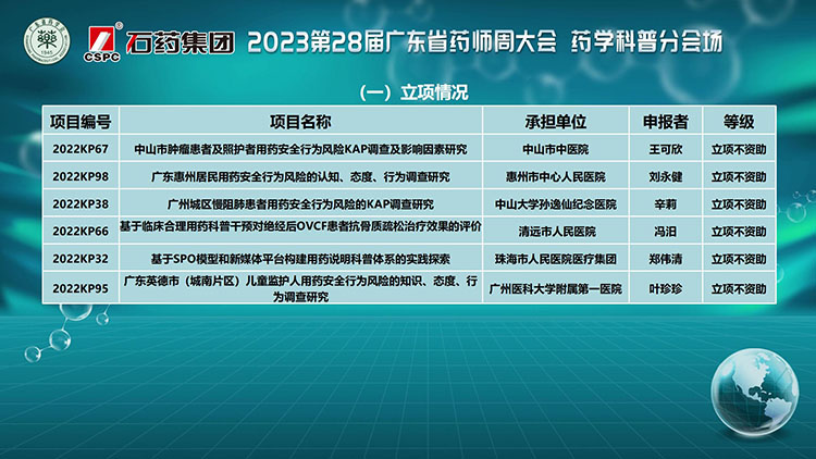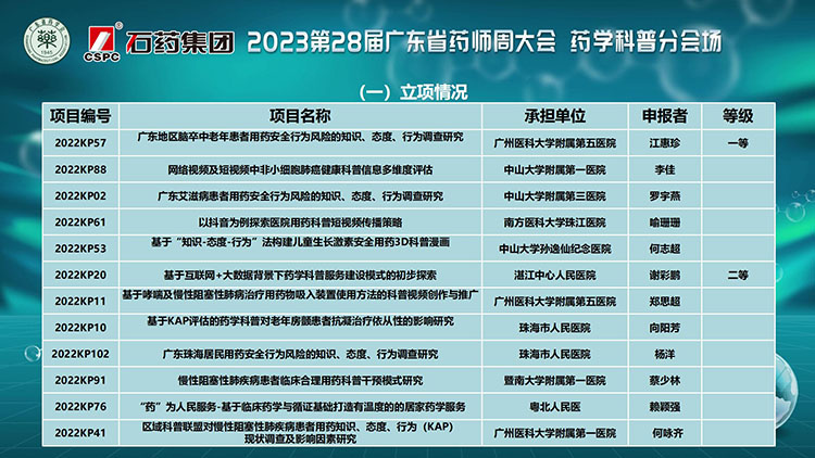 本環(huán)節(jié)分別由中山大學(xué)孫逸仙紀(jì)念醫(yī)院藥學(xué)部副主任余曉霞副主任藥師和廣州醫(yī)科大學(xué)附屬第一醫(yī)院藥學(xué)部主任魏理主任藥師主持,首先,大會向參與人員展示了2022年廣東省藥學(xué)科普研究基金立項情況,而后安排本次藥學(xué)科普立項排名前12名的立項人員對立項課題進(jìn)行簡短的講解與展示,廣州中醫(yī)藥大學(xué)第一附屬醫(yī)院主任藥師唐洪梅、中山大學(xué)孫逸仙紀(jì)念醫(yī)院主任藥師李國成、廣東省婦幼保健院主任藥師王穗瓊、中山大學(xué)附屬第一醫(yī)院主任藥師陳杰、廣州市紅十字會醫(yī)院主任藥師張述耀、中山大學(xué)孫逸仙紀(jì)念醫(yī)院主任藥師邱凱峰、南方醫(yī)科大學(xué)南方醫(yī)院主任藥師郭丹、廣東省中西醫(yī)結(jié)合醫(yī)院主任藥師吳曉玲、中山市人民醫(yī)院主任藥師劉銳鋒、南方醫(yī)科大學(xué)深圳醫(yī)院主任藥師楊西曉、南部戰(zhàn)區(qū)總醫(yī)院副主任藥師楊晨以及佛山市南海區(qū)人民醫(yī)院副主任藥師余靖華分別對分享的課題進(jìn)行點評,而后由暨南大學(xué)附屬第一醫(yī)院藥學(xué)部副主任王景浩主任藥師從評審角度為志愿者講述如何申報PSM廣東科普基金,并分享申報書的不足以及為大家傳授方法,希望通過本次培訓(xùn)以及優(yōu)秀科普展示提高在場志愿者對藥學(xué)科普基金立項的重視以及提高撰寫科普基金的能力,藥師志愿者通過藥學(xué)科普與管理與科研工作相結(jié)合,逐步實現(xiàn)形成“選題-實施-評價與反饋”的科普學(xué)術(shù)閉環(huán)。