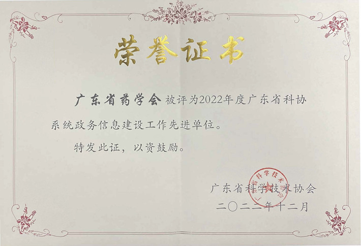 廣東省藥學會榮獲2022年度省科協(xié)系統(tǒng)政務(wù)信息建設(shè)工作先進單位