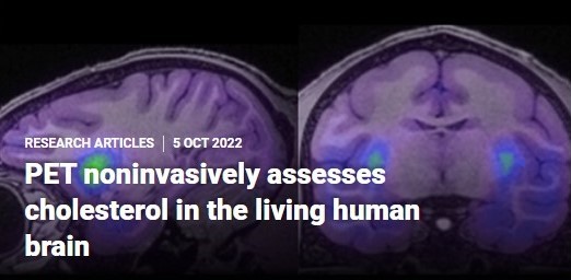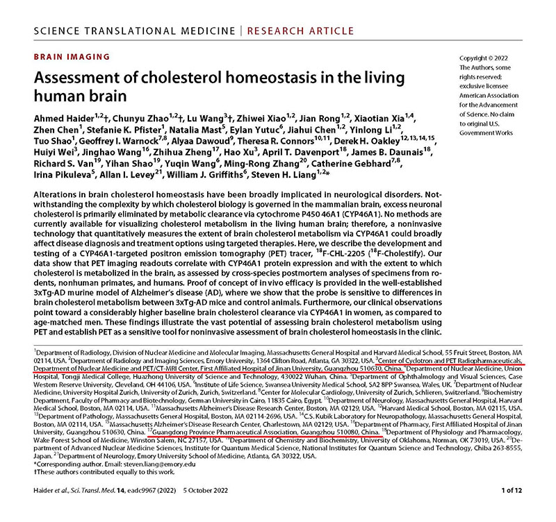在此基礎上,暨南大學附屬第一醫(yī)院聯合本會以及國外有關專家在Science子刊Science Translational Medicine上發(fā)表了PET藥物0期臨床研究文章(Haider A, Zhao C, Wang L, Xiao Z, Rong J, Xia X, Chen Z, Pfister SK, Mast N, Yutuc E, Chen J, Li Y, Shao T, Warnock GI, Dawoud A, Connors TR, Oakley DH, Wei H, Wang J, Zheng Z, Xu H, Davenport AT, Daunais JB, Van RS, Shao Y, Wang Y, Zhang MR, Gebhard C, Pikuleva I, Levey AI, Griffiths WJ, Liang SH. Assessment of cholesterol homeostasis in the living human brain. Sci Transl Med. 2022,14(665):eadc9967.)。大腦膽固醇在包括突觸可塑性、學習和記憶功能在內的關鍵生理功能中起重要作用,其在人腦中是通過代謝酶CYP46A1代謝的,該工作把可以與CYP46A1結合的化合物CHL-2250用18F標記,利用PET對CYP46A1顯影來間接觀察活人腦中膽固醇的穩(wěn)態(tài)。這是全球首例在活人腦中看到了膽固醇的穩(wěn)態(tài),對以后亨廷頓病、阿爾茨海默癥、癲癇、抑郁、柏金森病等腦疾病的影像學診斷可能有重要價值。