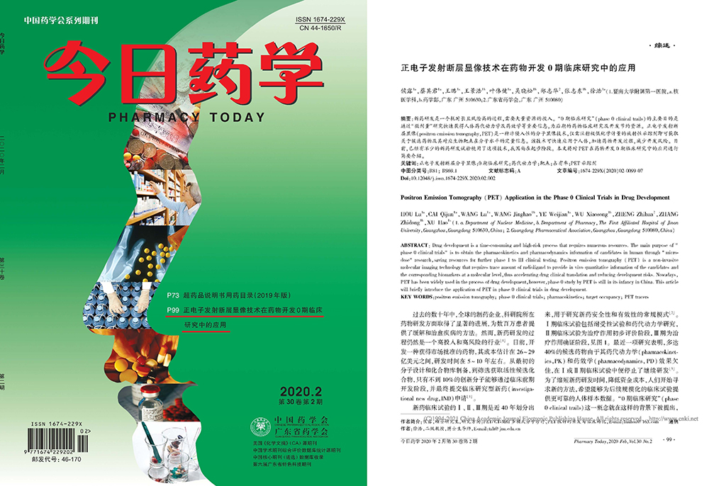 2019年12月18日,暨南大學附屬第一醫(yī)院聯合本會在《今日藥學》發(fā)表綜述性論文“正電子發(fā)射斷層顯像技術在藥物開發(fā)0期臨床研究中的應用”(侯露,蔡其君,王璐,王景浩,葉偉健,吳曉松,鄭志華,張志東,徐浩.正電子發(fā)射斷層顯像技術在藥物開發(fā)0期臨床研究中的應用[J].今日藥學,2020,30(02):99-105.),根據國際藥物開發(fā)模式,在國內首次正式提出利用PET分子影像進行藥物開發(fā)0期臨床研究的概念。