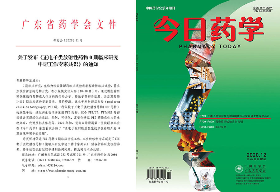 為更好地促進PET藥物0期臨床研究工作,本會組織專家制定了《正電子類放射性藥物0期臨床研究申請工作專家共識》(廣東省藥學會.正電子類放射性藥物0期臨床研究申請工作專家共識[J].今日藥學,2020,30(12):793-798.),該共識由暨南大學附屬第一醫(yī)院王璐和王景浩兩位博士執(zhí)筆,于2020年5月8日發(fā)布。該共識指出,持有最高級別《放射性藥品使用許可證》(Ⅳ類)的醫(yī)療機構,可將自行研發(fā)的其它新型PET藥物經過所在醫(yī)療機構內倫理審核,快速應用到臨床開展0期臨床研究,進而獲取人體數據信息,推動疾病精準診斷,促進新藥研發(fā)轉化。