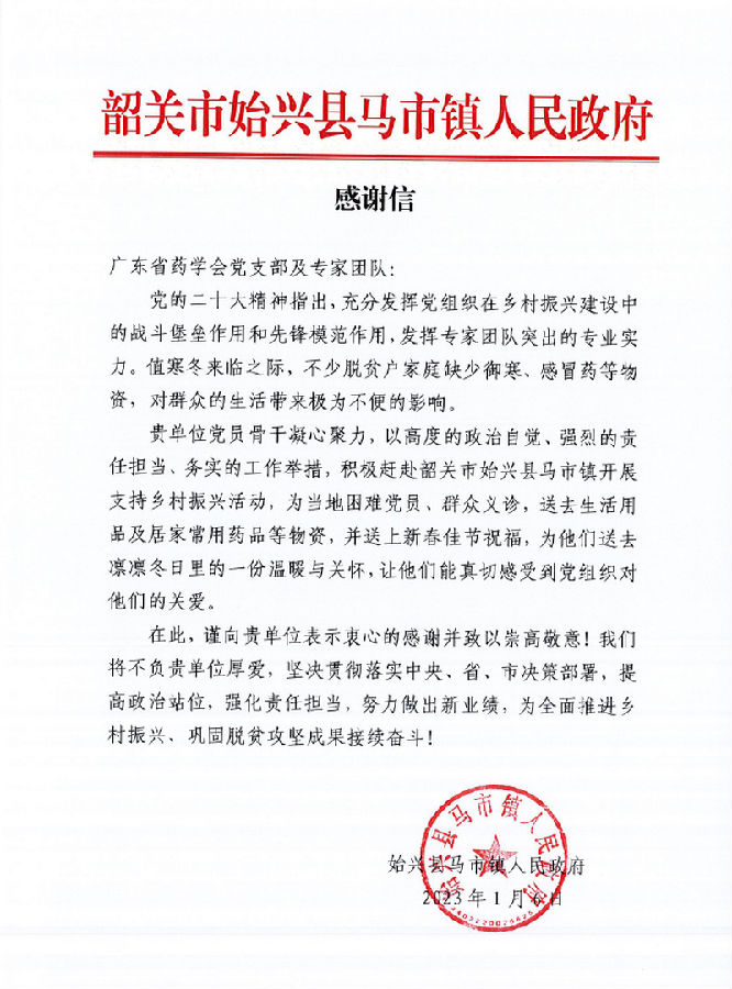 為認(rèn)真貫徹落實(shí)黨的二十大精神,響應(yīng)黨中央、國(guó)務(wù)院鄉(xiāng)村振興號(hào)召,充分發(fā)揮黨組織在鄉(xiāng)村振興建設(shè)中的戰(zhàn)斗堡壘作用和先鋒模范作用,發(fā)揮專家團(tuán)隊(duì)突出的專業(yè)實(shí)力,將安全用藥、合理用藥知識(shí)送到基層,將黨和政府對(duì)廣大鄉(xiāng)村的關(guān)懷、關(guān)愛送到基層,2023年1月6日,新年伊始,廣東省藥學(xué)會(huì)黨支部會(huì)同粵北人民醫(yī)院門診第三黨支部、廣州國(guó)盈醫(yī)藥有限公司黨總支、阿斯利康廣州黨支部一道,前往粵北始興縣馬市鎮(zhèn),開展“送醫(yī)送藥進(jìn)鄉(xiāng)村?真情幫扶暖民心”主題黨日活動(dòng)。