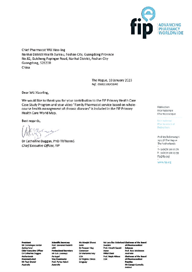近日,廣東省佛山市南海區(qū)“基于慢病全程健康管理的家庭藥師制度(Family Pharmacist service based on wholecourse health management of chronic diseases)”項目,經(jīng)廣東省藥學(xué)會推薦、國際藥學(xué)聯(lián)合會遴選,成功入選 “世界衛(wèi)生組織(WHO)基本衛(wèi)生保?。≒rimary Health Care, PHC)藥學(xué)計劃全球經(jīng)典案例”,在國際藥學(xué)聯(lián)合會官網(wǎng)以視頻方式分享給全球153個成員藥學(xué)同行。