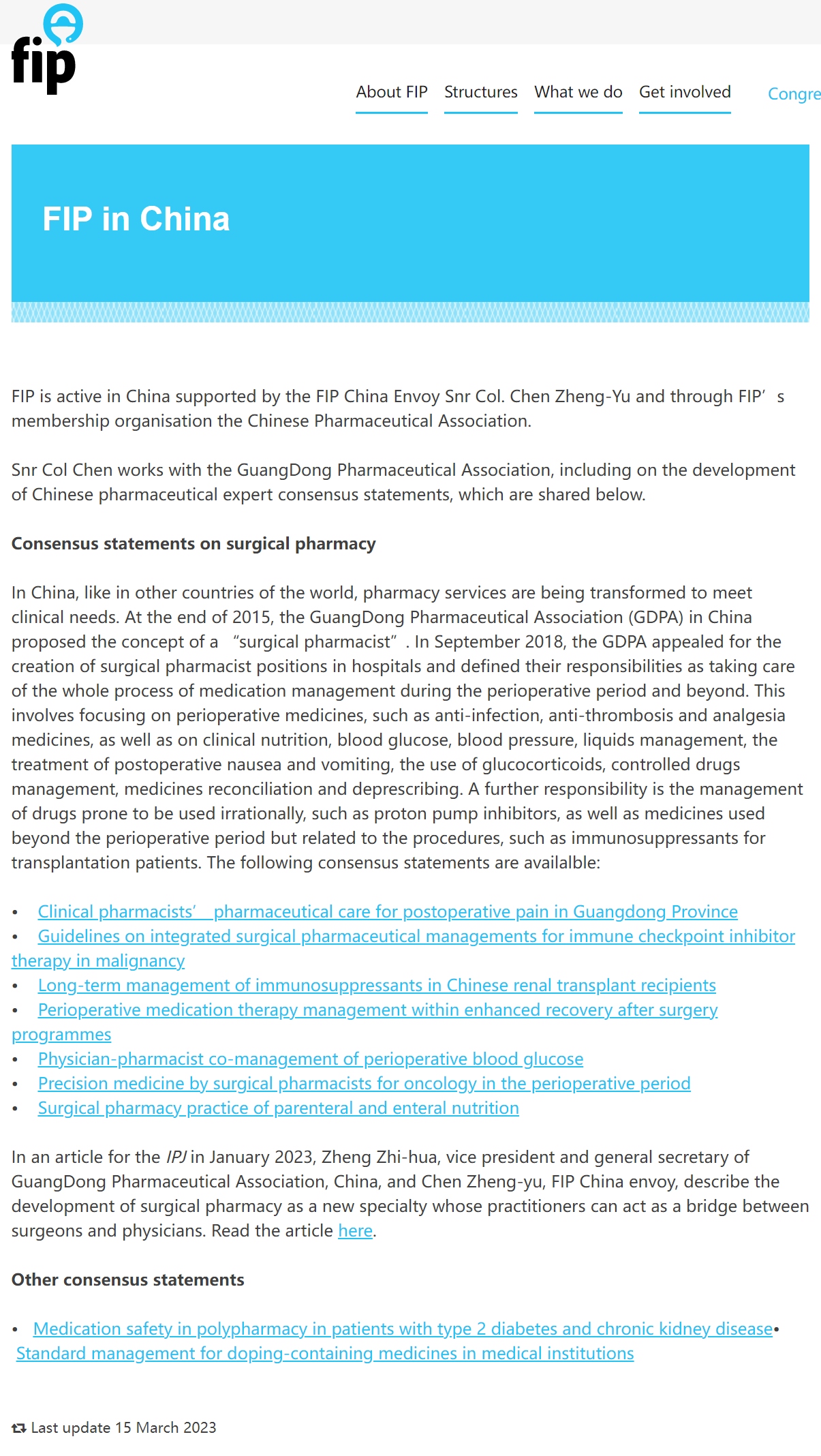 近日,國(guó)際藥學(xué)聯(lián)合會(huì)(FIP)在其全球網(wǎng)站(www.fip.org)開(kāi)設(shè)了“Pharmacy in China”專欄(https://www.fip.org/pharmacy-in-china),其中刊登了由中國(guó)藥學(xué)專家最新撰寫的9個(gè)藥學(xué)專家共識(shí),分享給全球的400多萬(wàn)藥師、藥學(xué)科研工作者和藥學(xué)教育專家。2023年1月,廣東省藥學(xué)會(huì)副理事長(zhǎng)兼秘書長(zhǎng)鄭志華與FIP中國(guó)總代表、FIP院士陳征宇聯(lián)合在FIP官方雜志《International Pharmacy Journal》發(fā)表了 "Surgical pharmacy — a new specialty to expand pharmacists’ role in surgical care"一文,向國(guó)際藥學(xué)界介紹了外科藥學(xué)這一新興學(xué)科,此次登載的7個(gè)專家共識(shí)專注于外科藥學(xué)領(lǐng)域,因此網(wǎng)站專門增設(shè)了“外科藥學(xué)”專欄。7個(gè)共識(shí)如下: