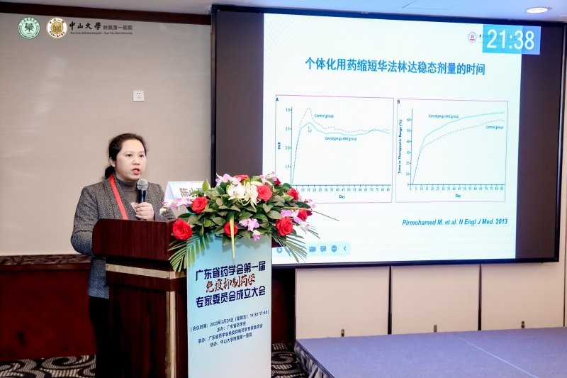 成立大會結(jié)束后進(jìn)入學(xué)術(shù)報告環(huán)節(jié),本環(huán)節(jié)共邀請到三位專家授課。首先是中山大學(xué)藥學(xué)院的王雪丁教授介紹免疫抑制藥物的個體化用藥熱點進(jìn)展,王教授著重分享硫唑嘌呤藥物在炎癥性腸病的個體化用藥科研成果;隨后,中山大學(xué)附屬第一醫(yī)院夏延哲教授分享新藥來特莫韋治療巨細(xì)胞病毒感染的臨床研究數(shù)據(jù),其創(chuàng)新作用機制靶向病毒末段酶,強化藥效的同時也提升安全性;接下來,中南大學(xué)湘雅醫(yī)院陳小平教授結(jié)合自身研究成果,分享心血管疾病的藥物基因組學(xué)與個體化用藥,報告以藥物基因組與藥物反應(yīng)的個體差異和抗血小板治療面臨的主要臨床問題為主要對象,分別從華法林、他汀類和氯吡格雷等藥物的臨床療效和用法用量進(jìn)行闡述。