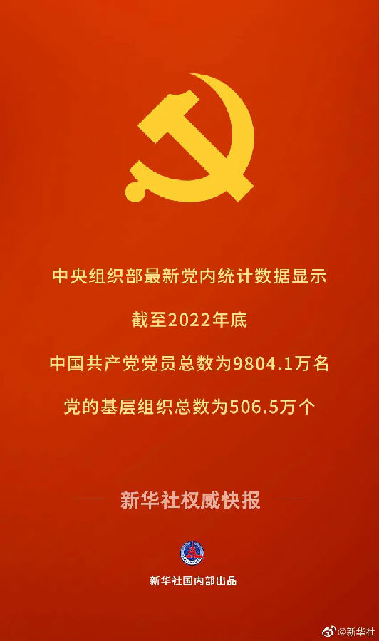 中央組織部最新黨內(nèi)統(tǒng)計(jì)數(shù)據(jù)顯示,截至2022年底,中國(guó)共產(chǎn)黨黨員總數(shù)為9804.1萬(wàn)名,比上年凈增132.9萬(wàn)名,黨的基層組織506.5萬(wàn)個(gè),比上年凈增12.9萬(wàn)個(gè)。
