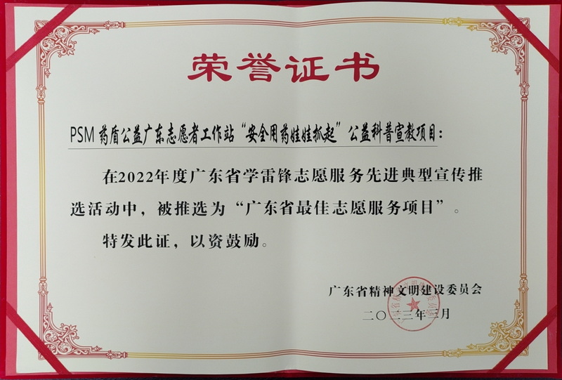 “PSM安全用藥娃娃抓起”項(xiàng)目被推選為“廣東省最佳志愿服務(wù)項(xiàng)目”