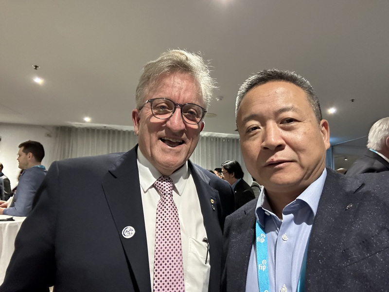 圖9 FIP主席Paul Sinclair AM欣然佩戴廣東省藥學會的“外科藥學”徽章與陳征宇院士合影