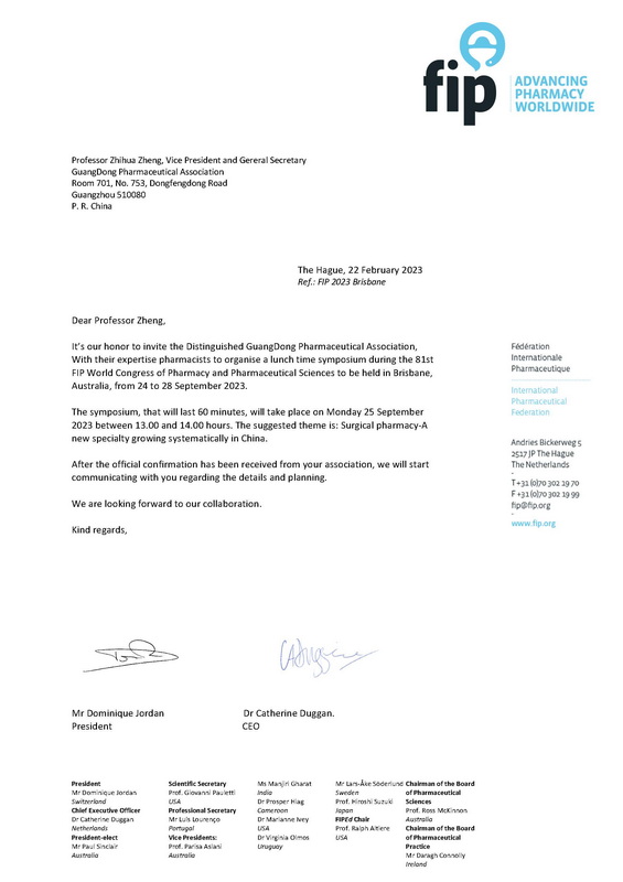 廣東省藥學會于2015年率先提出“外科藥師”概念;2018年9月,發(fā)文呼吁設立外科藥師;2020年12月正式提出并構建了外科藥師的知識體系——外科藥學;2021年5月,組織編寫、由中國醫(yī)藥科技出版社出版了第一本《外科藥學》教材;同年6月,在BMJ系列期刊——《歐洲醫(yī)院藥學雜志》(European Journal of Hospital Pharmacy)發(fā)表了“外科藥師的知識體系——外科藥學(Surgical Pharmacy)”,首次向國外同行推介外科藥學。2023年1月30日,國際藥學聯(lián)合會(FIP)在其官刊——《國際藥學雜志》(International Pharmacy Journal)發(fā)文系統(tǒng)介紹了“外科藥學”學科并在其全球官網設立了外科藥學專欄,推介了廣東省藥學會發(fā)布的8份相關文件;同年2月22日,F(xiàn)IP時任主席Dominique Jordan和CEO Catherine Duggan來函,邀請廣東省藥學會在第81屆世界藥學大會上協(xié)助組織外科藥學論壇。