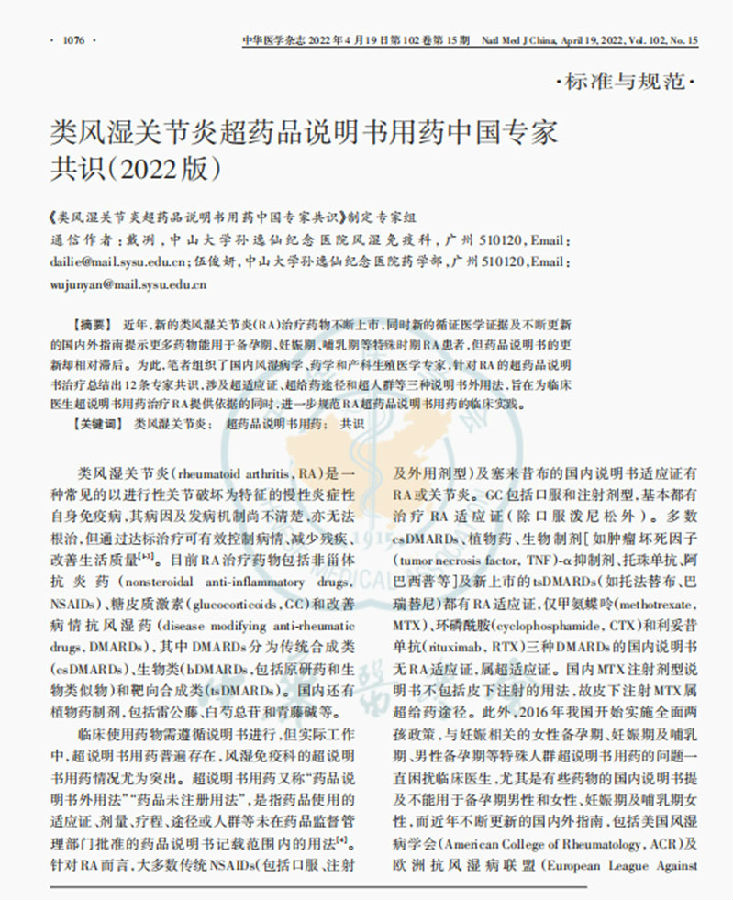 近年,新的類風濕關(guān)節(jié)炎(RA)治療藥物不斷上市,同時新的循證醫(yī)學(xué)證據(jù)及不斷更新的國內(nèi)外指南提示更多藥物能用于備孕期、妊娠期、哺乳期等特殊時期 RA患者,但藥品說明書的更新卻相對滯后。因此,中山大學(xué)孫逸仙紀念醫(yī)院風濕免疫科戴冽主任和藥學(xué)部伍俊妍主任牽頭制訂的《類風濕關(guān)節(jié)炎超藥品說明書用藥中國專家共識(2022版)》(以下簡稱本共識),本共識的執(zhí)筆專家是中山大學(xué)孫逸仙紀念醫(yī)院風濕免疫科的莫穎倩副主任醫(yī)師和藥學(xué)部的林茵副主任藥師,涉及超適應(yīng)證、超給藥途徑和超人群等三種說明書外用法,旨在為臨床醫(yī)生超說明書用藥治療RA提供依據(jù)的同時,進一步規(guī)范RA超藥品說明書用藥的臨床實踐。(廣東省藥學(xué)會風濕免疫用藥專家委員會供稿、圖)
