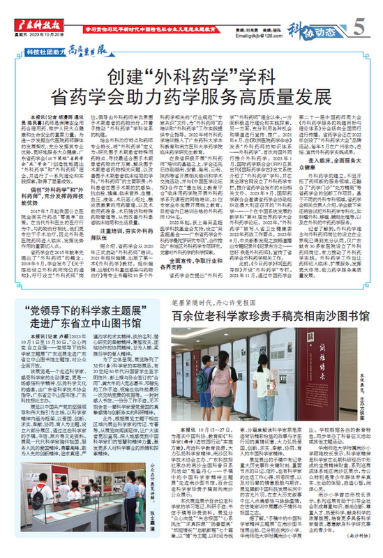 廣東省藥學會會“外科藥學”工作項目榮譽入選,并于2023年10月20日在“科技社團助力高質量發(fā)展”專欄頭版報道。