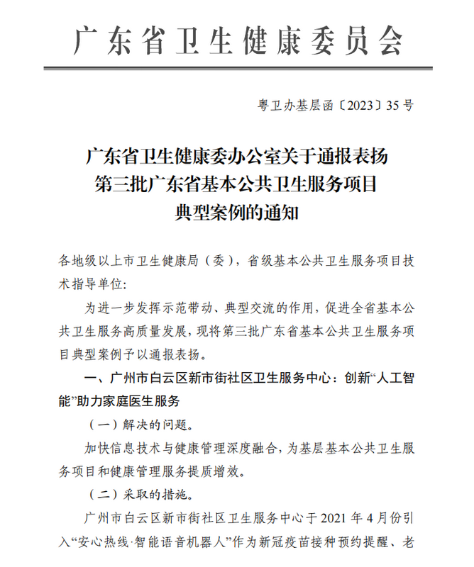 近日,廣東省衛(wèi)生健康委員會頒發(fā)《廣東省衛(wèi)生健康委辦室關于通報表揚第三批廣東省基本公共衛(wèi)生服務項目典型案例的通知》(粵衛(wèi)辦基層函〔2023〕35號),廣東省藥學會全科醫(yī)學專家委員會副主任委員單位、白云區(qū)新市街社區(qū)衛(wèi)生服務中心(以下簡稱新市社衛(wèi))的“創(chuàng)新‘人工智能’助力家庭醫(yī)生服務”項目榮列榜首。