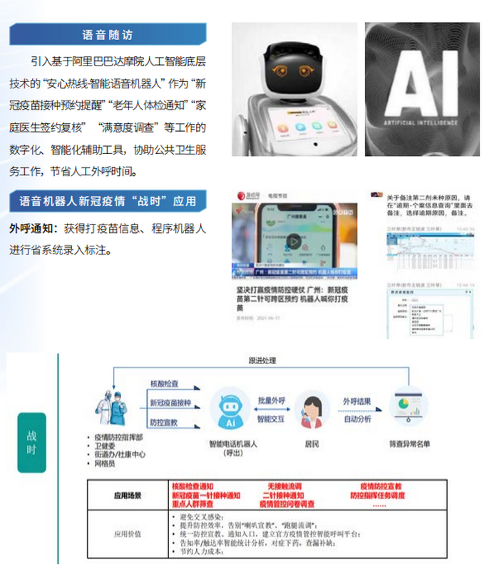 根據(jù)黨的十九大報告精神和習近平總書記“為人民群眾提供全方位全周期健康服務”的指示,按照《國務院辦公廳關于促進“互聯(lián)網(wǎng) 醫(yī)療健康”發(fā)展的意見》以及國家衛(wèi)健委《關于做好2018年家庭醫(yī)生簽約服務工作的通知》等文件精神,新市社衛(wèi)致力發(fā)展區(qū)內“人工智能”的數(shù)智化應用,充分運用智能語音、大數(shù)據(jù)、人工智能等技術,在服務流程、服務工具、服務方式、服務效率等方面進行突破創(chuàng)新,加快信息技術與健康管理深度融合,為基層公衛(wèi)和健康管理服務提質增效,提高居民對基層醫(yī)療衛(wèi)生健康服務的感知認知和服務體驗;在白云區(qū)內率先引入基于阿里巴巴達摩院人工智能底層技術,成為省級項目示范性試點單位。新市社衛(wèi)聯(lián)合省CDC項目組,在對全省外呼調查之前,做了多輪內部測試、超1000人次真實居民智能語音調查,以及對智能語音調查的話術調整建議,成功助力省級項目高效、順利落地。
