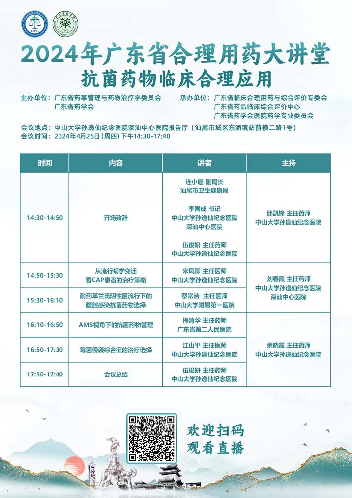 為貫徹落實(shí)《國(guó)家衛(wèi)生健康委等六部門(mén)關(guān)于加強(qiáng)醫(yī)療機(jī)構(gòu)藥事管理促進(jìn)合理用藥的意見(jiàn)》(國(guó)衛(wèi)醫(yī)發(fā)(2020)2號(hào)),《國(guó)家衛(wèi)生健康委辦公廳關(guān)于持續(xù)做好抗菌藥物臨床應(yīng)用管理工作的通知》(國(guó)衛(wèi)辦醫(yī)發(fā)[2020]8號(hào))等文件精神,進(jìn)一步加強(qiáng)醫(yī)院抗菌藥物科學(xué)化管理,提高抗菌藥物合理應(yīng)用能力,遏制微生物耐藥發(fā)展與蔓延,提升感染性疾病臨床診療水平,保證醫(yī)療質(zhì)量和醫(yī)療安全,2024年4月25日,由廣東省藥事管理與藥物治療學(xué)委員會(huì)、廣東省藥學(xué)會(huì)主辦,廣東省藥學(xué)會(huì)醫(yī)院藥學(xué)專(zhuān)業(yè)委員會(huì)、廣東省藥品臨床綜合評(píng)價(jià)中心等聯(lián)合承辦的2024年廣東省合理用藥大講堂(第一站)——抗菌藥物臨床合理應(yīng)用培訓(xùn)會(huì)議在中山大學(xué)孫逸仙紀(jì)念醫(yī)院深汕中心醫(yī)院舉辦。