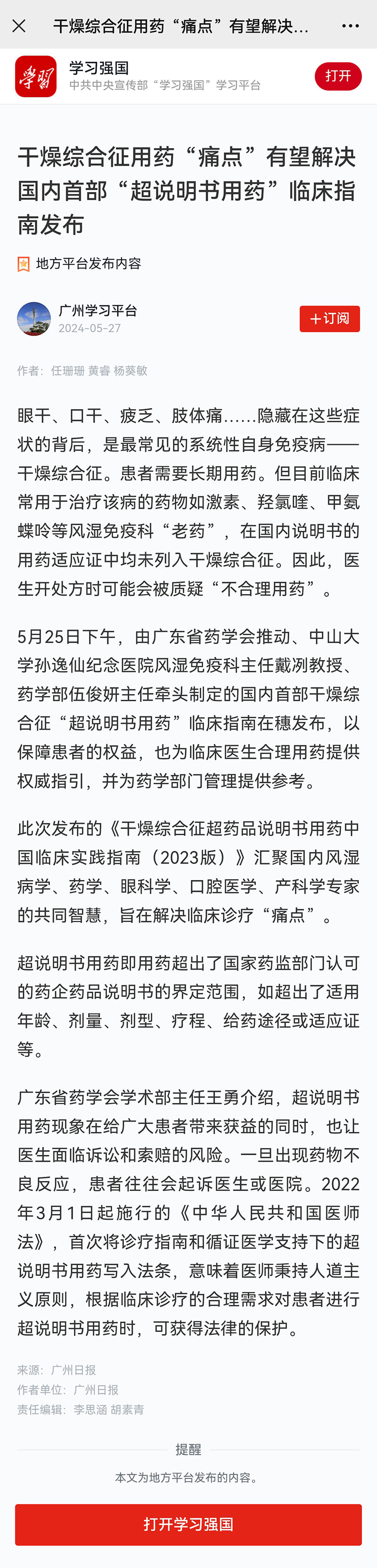 《廣州日?qǐng)?bào)新花城》及《廣州日?qǐng)?bào)》記者任珊珊以“干燥綜合征用藥‘痛點(diǎn)’有望解決 國(guó)內(nèi)首部‘超說(shuō)明書(shū)用藥’臨床指南發(fā)布”為題進(jìn)行了報(bào)道,該文于2024年5月27日在《學(xué)習(xí)強(qiáng)國(guó)》平臺(tái)發(fā)布。
