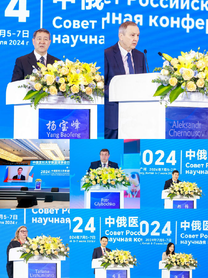 7月5日-7日,中俄醫(yī)科大學聯(lián)盟理事會2024年會暨中俄醫(yī)藥發(fā)展國際學術大會在廣州越秀國際會議中心召開。此次大會由中俄醫(yī)科大學聯(lián)盟主辦,廣東省藥學會、暨南大學、哈爾濱醫(yī)科大學、莫斯科國立第一醫(yī)科大學聯(lián)合承辦。中俄兩國醫(yī)藥衛(wèi)生領域11位院士楊寶峰、高天明、姜保國、邢鋒、劉超、劉良、吉訓明、Petr Glybochko、Igor Yesaulenko、Valentin Pavlov、Valentin Shumatov以及30余所中俄頂尖醫(yī)藥學府的領導與嘉賓、450余名中外學者出席大會,旨在通過高水平的學術對話與思維碰撞,推動中俄醫(yī)學事業(yè)的繁榮發(fā)展。大會開幕式由暨南大學洪岸副校長主持。