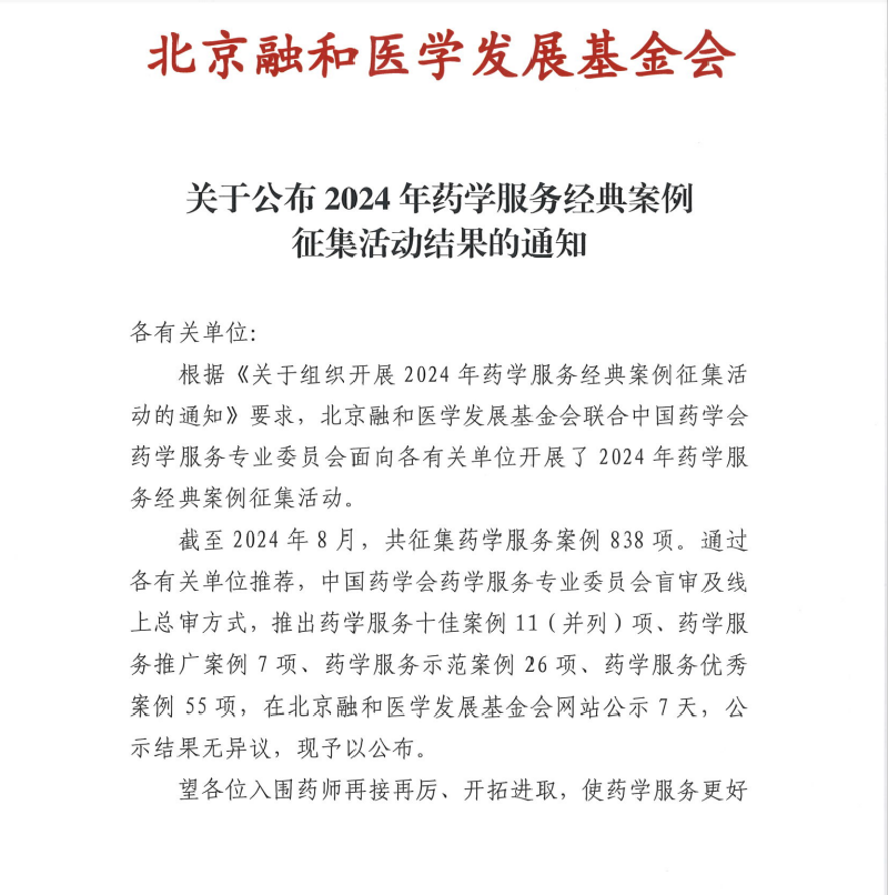 根據《關于組織開展2024年藥學服務經典案例征集活動的通知》要求,北京融和醫(yī)學發(fā)展基金會聯(lián)合中國藥學會藥學服務專業(yè)委員會面向各有關單位開展了2024年藥學服務經典案例征集活動。