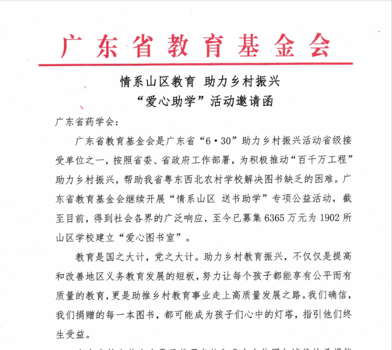 廣東省藥學(xué)會(huì)繼續(xù)積極支持我省“百千萬(wàn)工程-情系山區(qū)送書(shū)助學(xué)”專(zhuān)項(xiàng)公益活動(dòng),助推我省粵東西北鄉(xiāng)村教育事業(yè),支持學(xué)校建設(shè)書(shū)香校園,以實(shí)際行動(dòng)為我省革命老區(qū)、邊遠(yuǎn)山區(qū)教育事業(yè)添磚加瓦、奉獻(xiàn)愛(ài)心,彰顯社會(huì)責(zé)任與社會(huì)擔(dān)當(dāng)。