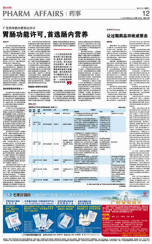 國內(nèi)醫(yī)藥權(quán)威媒體——《醫(yī)藥經(jīng)濟報》于2012年7月4日詳細(xì)報道了我會制定的《腸內(nèi)營養(yǎng)臨床藥學(xué)共識》。