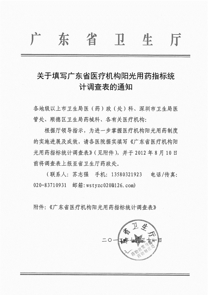 省衛(wèi)生廳“關(guān)于填寫(xiě)廣東省醫(yī)療機(jī)構(gòu)陽(yáng)光用藥指標(biāo)統(tǒng)計(jì)調(diào)查表的通知”