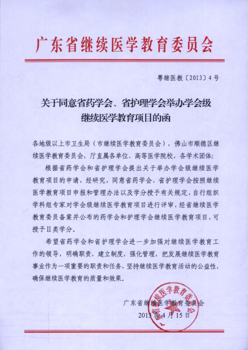 根據(jù)廣東省繼續(xù)醫(yī)學教育委員會《關(guān)于同意省藥學會、省護理學會舉辦學會級繼續(xù)醫(yī)學教育項目的函》(粵繼醫(yī)教[2013]4號)的批復,本會獲得授予繼續(xù)醫(yī)學教育項目Ⅱ類學分資格。