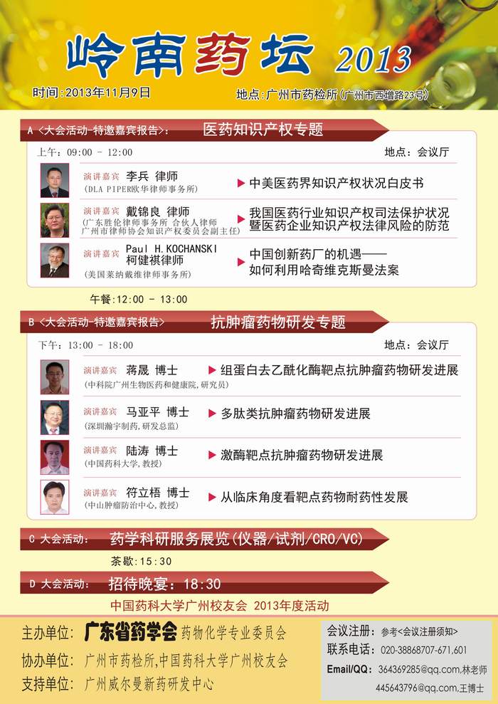 經(jīng)研究決定廣東省藥學會藥物化學專業(yè)委員會2013年度學術(shù)活動《嶺南藥壇2013》定于11月9日召開,活動安排如下: