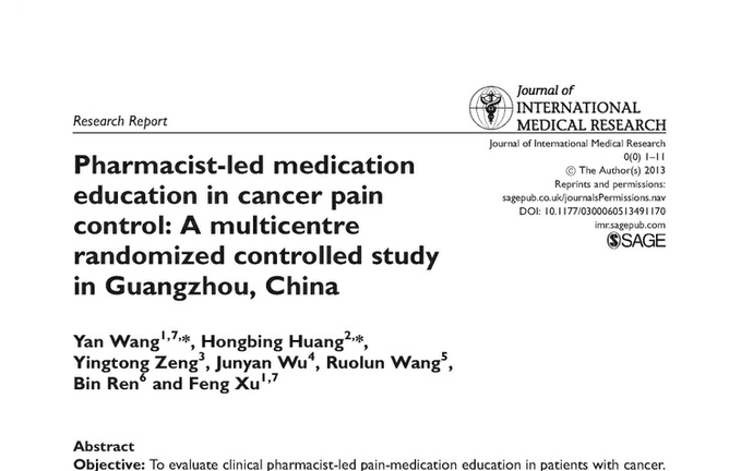 由本會(huì)組織、西安楊森制藥有限公司支持的“藥師主導(dǎo)的癌癥疼痛用藥教育:一項(xiàng)在中國(guó)廣州的多中心隨機(jī)研究”的研究論文,經(jīng)過(guò)近3年的努力,最近在SCI雜志——Journal of International Medical Research上發(fā)表。