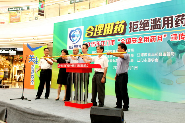 9月1日上午,由江門(mén)市食品藥品監(jiān)督管理局主辦,江門(mén)市藥學(xué)會(huì)、蓬江局、江海局和新會(huì)局聯(lián)合承辦的2015年“全國(guó)安全用藥月”江門(mén)啟動(dòng)儀式在萬(wàn)達(dá)廣場(chǎng)舉行。江門(mén)市副市長(zhǎng)陳佳林出席啟動(dòng)儀式并致詞,江門(mén)市政協(xié)副主席趙樹(shù)培以及市直相關(guān)部門(mén)的負(fù)責(zé)人參加,啟動(dòng)儀式由江門(mén)市食品藥品監(jiān)督管理局局長(zhǎng)方國(guó)平主持,來(lái)自市區(qū)相關(guān)藥品生產(chǎn)、經(jīng)營(yíng)、醫(yī)療機(jī)構(gòu)及市民代表共300多人參加活動(dòng)。