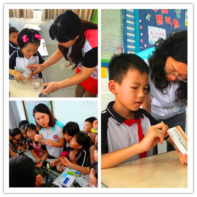 在幻燈片演示環(huán)節(jié),藥師們針對(duì)近年的藥害案例,以漫畫的形式向?qū)W生們演示,并在講解過程中穿插多個(gè)互動(dòng)問答游戲。在PPT講解完畢后志愿者播放有關(guān)安全用藥知識(shí)的動(dòng)畫,通過興趣學(xué)習(xí)鞏固安全用藥知識(shí),期間,志愿者向?qū)W生們現(xiàn)場發(fā)放《安全使用抗菌藥物》和《安全使用維生素》等藥品安全知識(shí)宣傳材料近4500冊(cè),通過家校聯(lián)動(dòng),讓家長和學(xué)生共同了解安全用藥知識(shí)。學(xué)生是否理解是檢驗(yàn)授課是否成功的試金石,因此,活動(dòng)通過有獎(jiǎng)互動(dòng)問答游戲,了解并糾正學(xué)生們用藥誤區(qū),活躍了課堂氣氛。除此之外,志愿者們還走下講臺(tái),與孩子們?cè)谝黄鹱銎鹋蒡v片浸水試驗(yàn)、辨別藥品有效期和如何讀懂藥品說明書等游戲?qū)嶒?yàn),不僅讓學(xué)生更直觀地了解藥品,更調(diào)動(dòng)了學(xué)生的積極性。各家醫(yī)院在原定課程安排上增加了不少趣味性互動(dòng)環(huán)節(jié),如廣州市胸科醫(yī)院志愿者帶來了一整套藥品實(shí)驗(yàn),學(xué)生們對(duì)高錳酸鉀的變色實(shí)驗(yàn)大呼驚奇,也讓學(xué)生們對(duì)藥品的相互作用有了更深刻的了解。